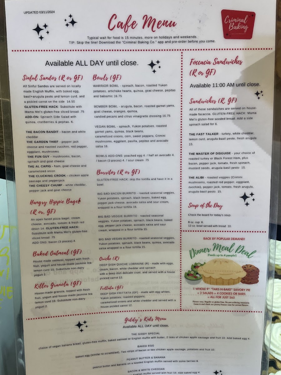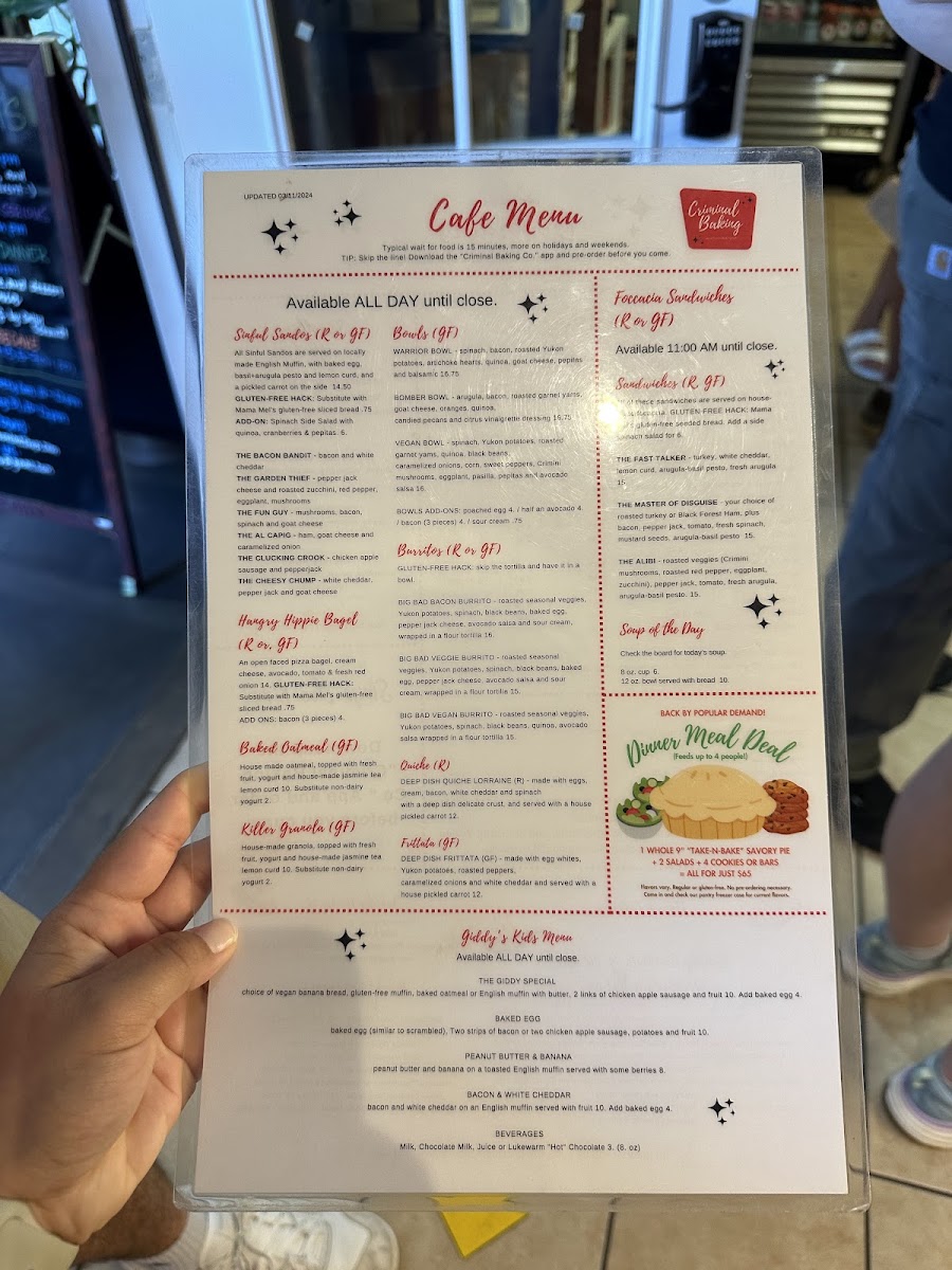 The menu at Criminal Baking Company offers a comfortable mix of bakery favorites and thoughtfully crafted breakfast and lunch options, perfect for a relaxed morning or a leisurely brunch. Whether you’re stopping by for a warm cappuccino alongside a gluten-free blackberry walnut muffin or settling in with a savory quiche or frittata, the offerings feel approachable and satisfying.